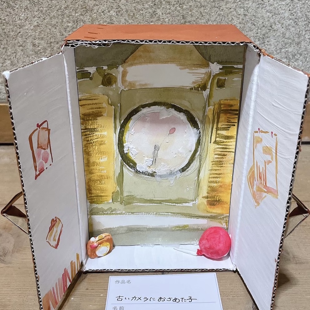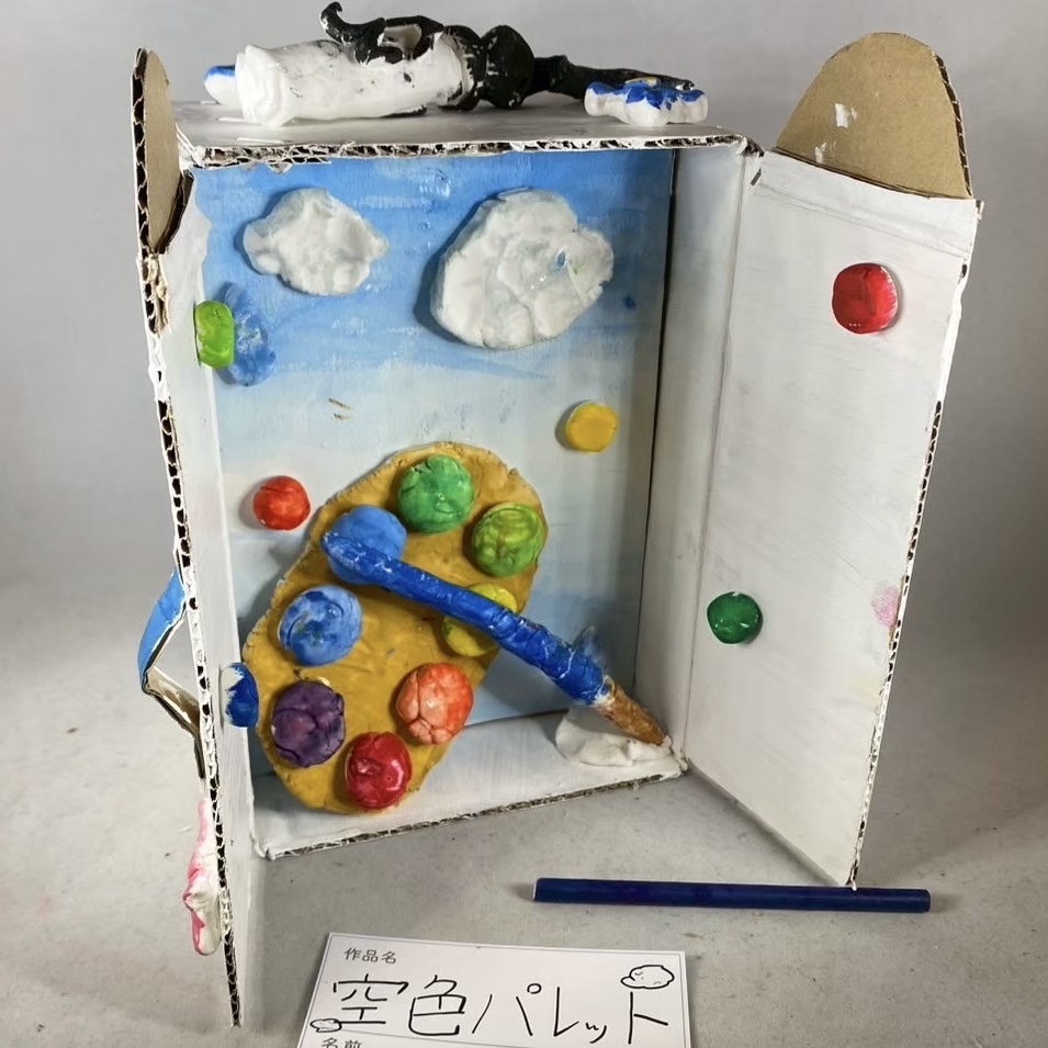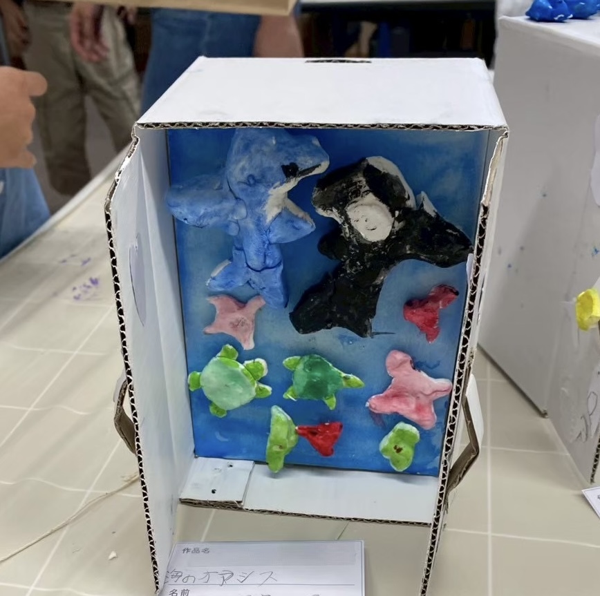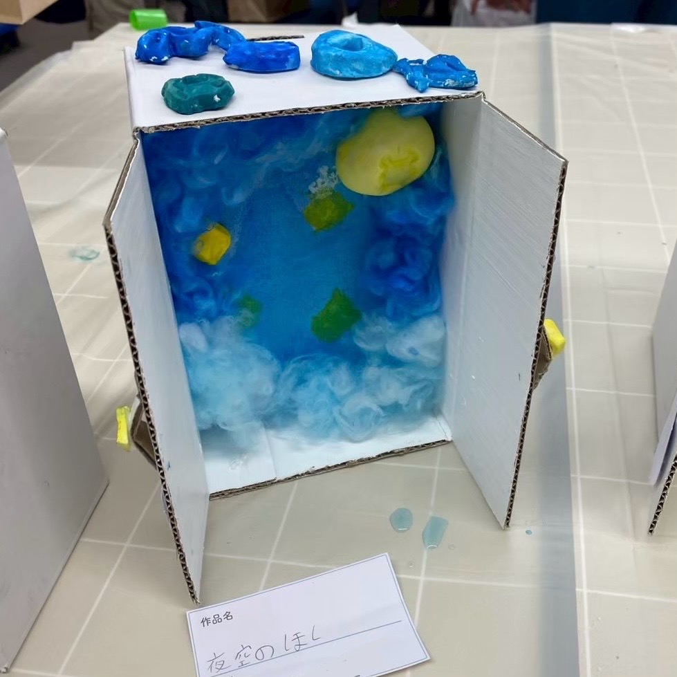 こんにちは!和泉府中教室を担当しています、なつみです☺️ 夏休み、6・7月は貯金箱を作っていました! テーマは「君は何をとじこめる?」 後ろ側はお金を入れて貯金箱にすることができ、前側は扉を開けるととじこめた世界が出てくるようになっています!