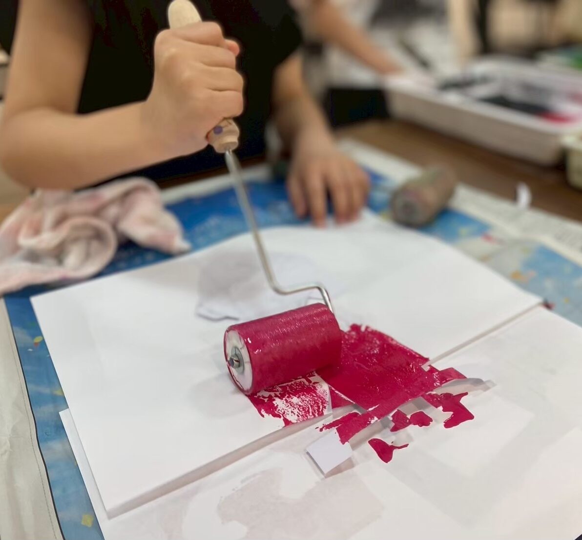 紙版画は、紙を切って重ねて貼った部分に凹凸ができ、凹凸のある版に絵の具をつけて紙に刷ると絵ができあがります!