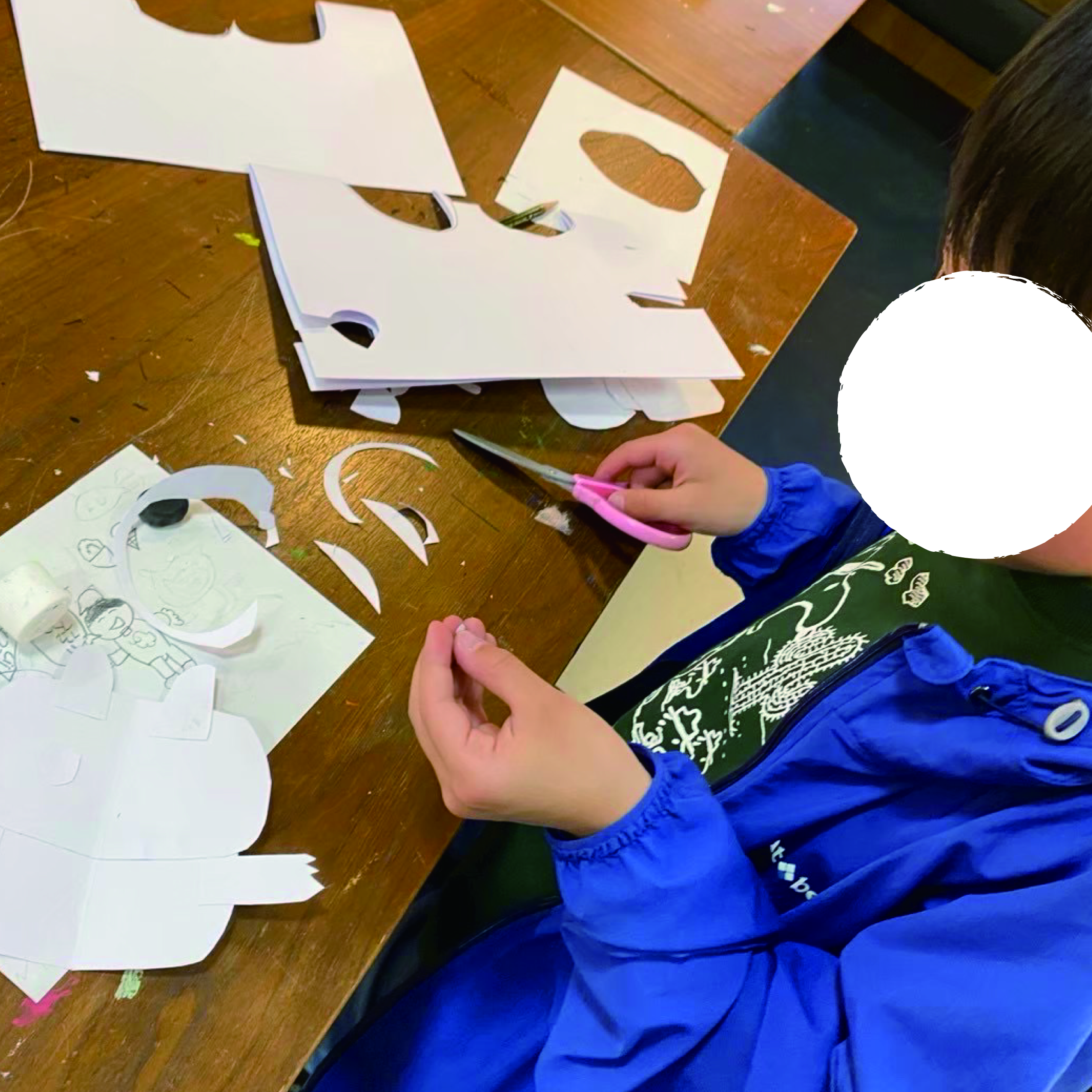 イメージスケッチをみながら顔・首・体のパーツを作り、そこからどんどん服や模様、小物を切って貼って付け足していきます。