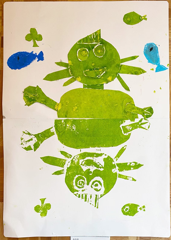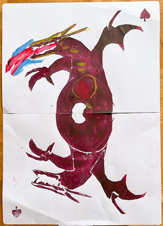 5月はトランプのように反転させた絵を2枚繋げた紙版画を作っていました